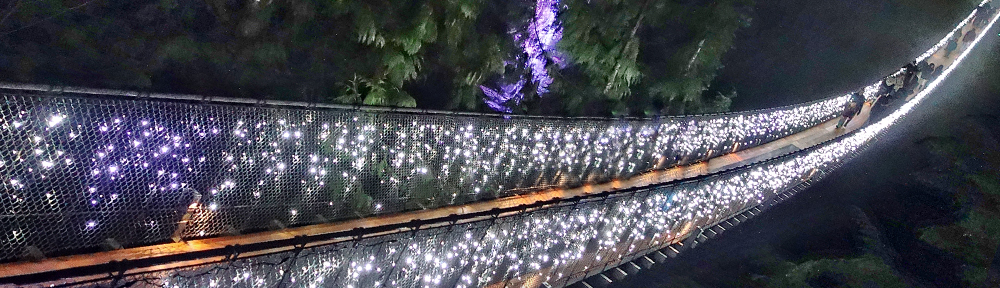 The Capilano Suspension bridge is a fun way to spend any given day with the spectacular views as you walk across the canyon, through the trees or along the Cliff Walk. Now add Christmas lights to the mix and the view becomes really amazing…